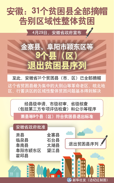 新華社合肥4月29日電(記者姜?jiǎng)偅?9日,安徽省政府宣布,金寨縣、阜陽(yáng)市潁東區(qū)等9個(gè)縣(區(qū))退出貧困縣序列。至此,安徽省31個(gè)貧困縣(市、區(qū))已全部摘帽,這個(gè)省貧困縣最為集中的大別山等革命老區(qū)、皖北地區(qū)、行蓄洪區(qū)的區(qū)域性整體貧困問(wèn)題基本得到解決。