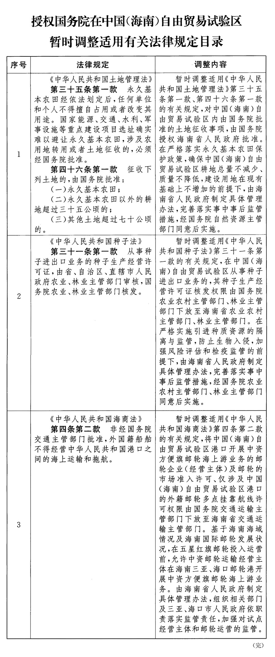 為支持海南全面深化改革開放,推動(dòng)中國(海南)自由貿(mào)易試驗(yàn)區(qū)試點(diǎn)政策落地,第十三屆全國人民代表大會(huì)常務(wù)委員會(huì)第十七次會(huì)議決定:授權(quán)國務(wù)院在中國(海南)自由貿(mào)易試驗(yàn)區(qū)暫時(shí)調(diào)整適用《中華人民共和國土地管理法》《中華人民共和國種子法》《中華人民共和國海商法》的有關(guān)規(guī)定(目錄附后),暫時(shí)調(diào)整適用的期限至2024年12月31日。暫時(shí)調(diào)整適用有關(guān)法律規(guī)定,必須建立健全事中事后監(jiān)管制度,有效防控風(fēng)險(xiǎn),國務(wù)院及其有關(guān)部門要加強(qiáng)指導(dǎo)、協(xié)調(diào)和監(jiān)督,及時(shí)總結(jié)試點(diǎn)工作經(jīng)驗(yàn),并就暫時(shí)調(diào)整適用有關(guān)法律規(guī)定的情況向全國人民代表大會(huì)常務(wù)委員會(huì)作出中期報(bào)告。對(duì)實(shí)踐證明可行的,修改完善有關(guān)法律;對(duì)實(shí)踐證明不宜調(diào)整的,恢復(fù)施行有關(guān)法律規(guī)定。