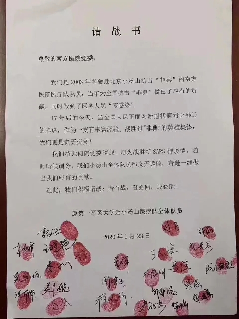 △1月23日,曾參加原第一軍醫(yī)大學(xué)赴小湯山醫(yī)療隊(duì)的南方醫(yī)院24名醫(yī)護(hù)人員寫(xiě)下請(qǐng)戰(zhàn)書(shū),主動(dòng)要求赴一線工作。