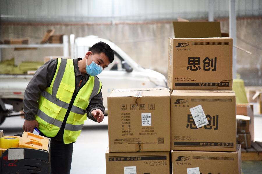 4月22日,山東臨沂新明輝商城的工作人員李效峰在查看貨物。新華社記者 王凱 攝