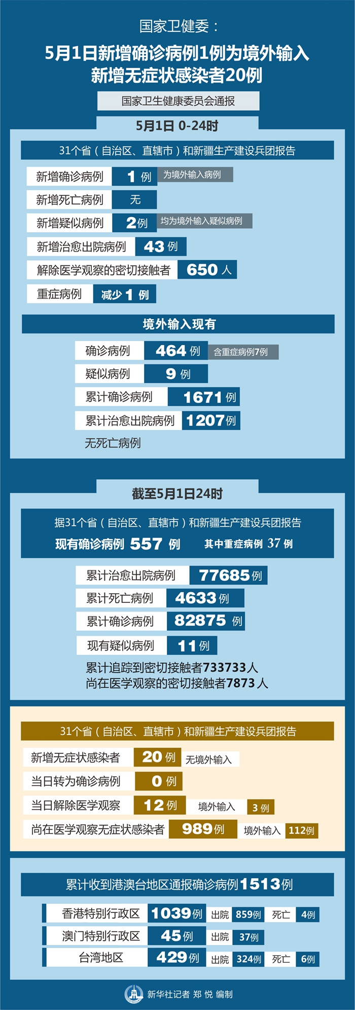 圖表:國家衛(wèi)健委:5月1日新增確診病例1例為境外輸入,新增無癥狀感染者20例 新華社記者 鄭悅 編制
