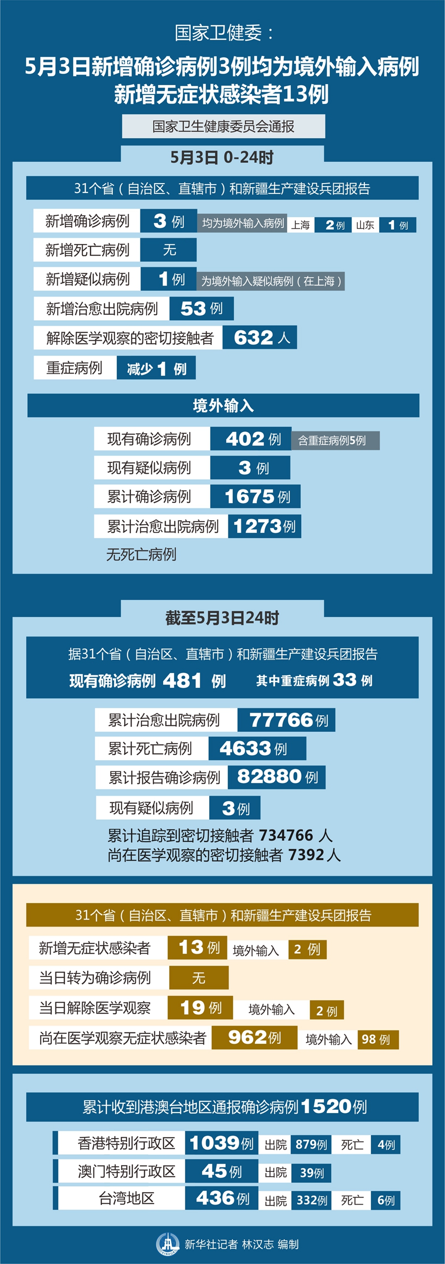 截至5月3日24時,據(jù)31個省(自治區(qū)、直轄市)和新疆生產(chǎn)建設(shè)兵團報告,現(xiàn)有確診病例481例(其中重癥病例33例),累計治愈出院病例77766例,累計死亡病例4633例,累計報告確診病例82880例,現(xiàn)有疑似病例3例。累計追蹤到密切接觸者734766人,尚在醫(yī)學(xué)觀察的密切接觸者7392人。