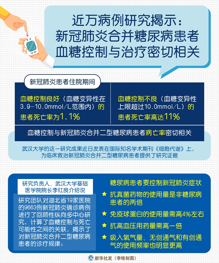 新華社武漢5月4日電(記者 王賢)新冠肺炎患者住院期間,血糖控制良好(血糖變異性在3.9-10.0mmol/L范圍內)的患者死亡率為1.1%,血糖控制不良(血糖變異性上限超過10.0mmol/L)的患者死亡率高達11%,血糖控制與新冠肺炎合并二型糖尿病患者病亡率密切相關。武漢大學的這一研究成果近日發(fā)表在國際知名學術期刊《細胞代謝》上,為臨床救治新冠肺炎合并二型糖尿病患者提供了研究證據。