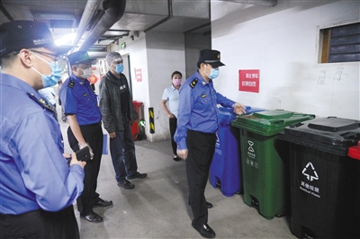 昨日,城管隊員檢查翠微大廈物業(yè)的垃圾分類收集容器。北京市城管執(zhí)法局供圖