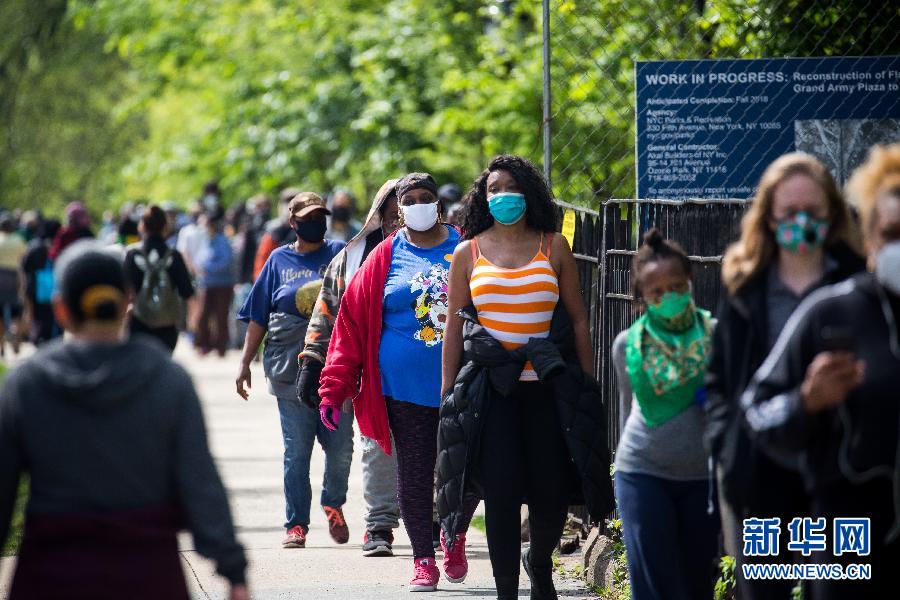 5月3日,在美國紐約,人們在一個發(fā)放點排隊領取口罩。 新華社發(fā)(郭克攝)