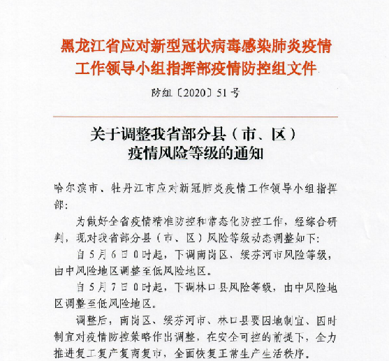 記者從黑龍江省應(yīng)對新型冠狀病毒感染肺炎疫情工作領(lǐng)導(dǎo)小組指揮部獲悉,5月5日黑龍江省應(yīng)對新型冠狀病毒感染肺炎疫情工作領(lǐng)導(dǎo)小組指揮部疫情防控組發(fā)布《關(guān)于調(diào)整我省部分縣(市、區(qū))疫情風(fēng)險等級的通知》,具體內(nèi)容為: