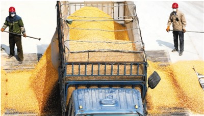 4月13日,在遼寧省鞍山市臺(tái)安縣新開河糧食儲(chǔ)備庫,兩名工作人員卸載剛剛收儲(chǔ)的玉米。新華社記者 姚劍鋒攝