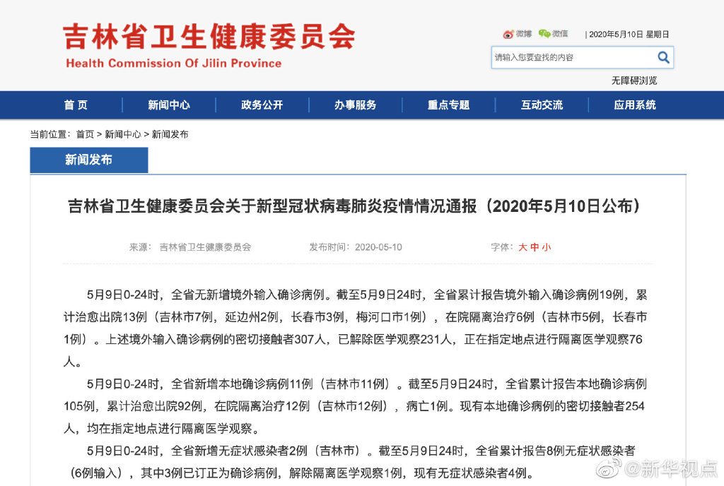 5月9日0-24時(shí),全省新增本地確診病例11例(吉林市11例)。截至5月9日24時(shí),全省累計(jì)報(bào)告本地確診病例105例,累計(jì)治愈出院92例,在院隔離治療12例(吉林市12例),病亡1例?,F(xiàn)有本地確診病例的密切接觸者254人,均在指定地點(diǎn)進(jìn)行隔離醫(yī)學(xué)觀察。