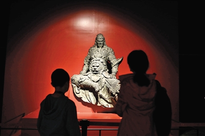 觀眾觀看明代關(guān)公坐像,河南新鄉(xiāng)博物館藏。本組稿件攝影/新京報記者 浦峰