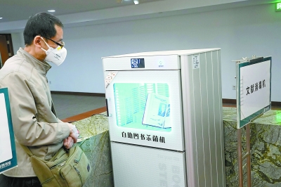 讀者利用自助圖書消毒設(shè)備為書籍消毒。記者 李洋
