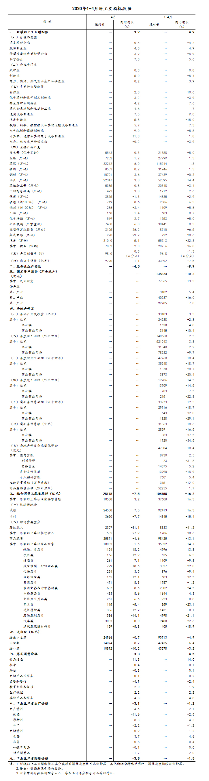 4月份,全國規(guī)模以上工業(yè)增加值同比增長3.9%,3月份為下降1.1%;環(huán)比增長2.27%。1-4月份,全國規(guī)模以上工業(yè)增加值同比下降4.9%,降幅比1-3月份收窄3.5個(gè)百分點(diǎn)。4月份,分經(jīng)濟(jì)類型看,國有控股企業(yè)增加值增長0.5%;股份制企業(yè)增長4.0%,外商及港澳臺(tái)商投資企業(yè)增長3.9%;私營企業(yè)增長7.0%。分三大門類看,采礦業(yè)增加值增長0.3%;制造業(yè)增長5.0%,3月份為下降1.8%;電力、熱力、燃?xì)饧八a(chǎn)和供應(yīng)業(yè)增長0.2%。高技術(shù)制造業(yè)和裝備制造業(yè)增長較快。4月份,高技術(shù)制造業(yè)和裝備制造業(yè)增加值分別增長10.5%和9.3%,快于規(guī)模以上工業(yè)6.6和5.4個(gè)百分點(diǎn)。從產(chǎn)品產(chǎn)量看,光纜,挖掘、鏟土運(yùn)輸機(jī)械,集成電路,工業(yè)機(jī)器人,微型計(jì)算機(jī)設(shè)備產(chǎn)量同比分別增長43.8%、40.8%、29.2%、26.6%、26.2%。