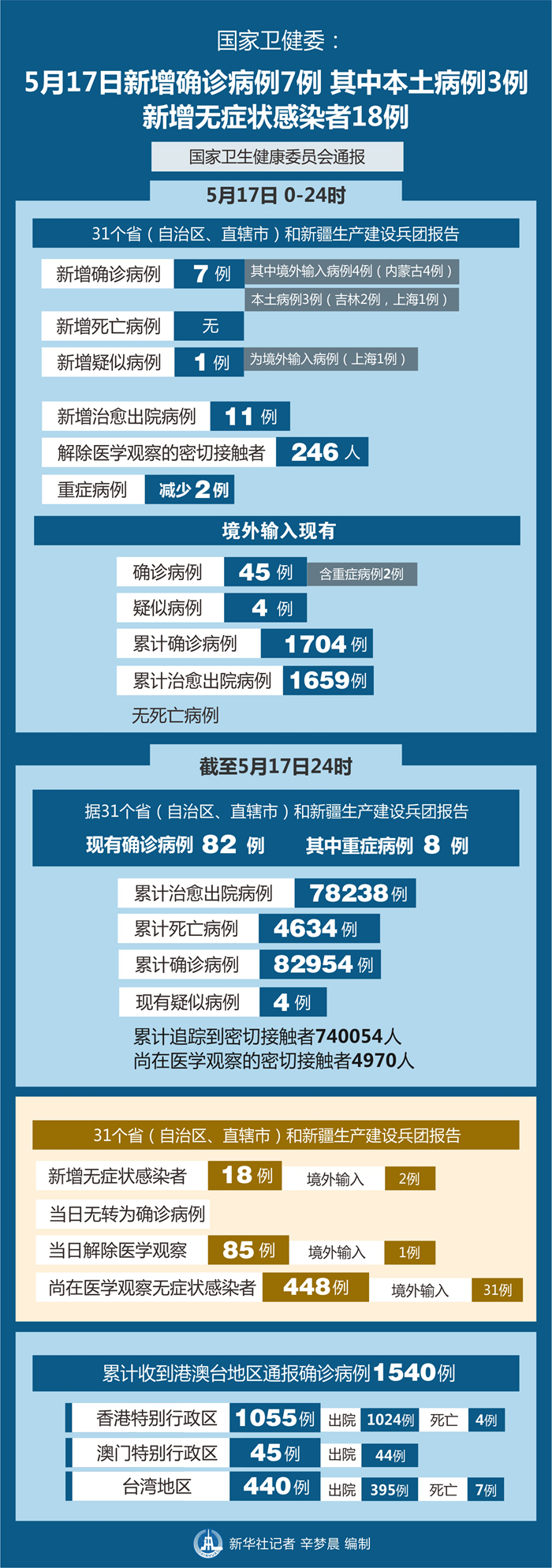 截至5月17日24時(shí),據(jù)31個(gè)?。ㄗ灾螀^(qū)、直轄市)和新疆生產(chǎn)建設(shè)兵團(tuán)報(bào)告,現(xiàn)有確診病例82例(其中重癥病例8例),累計(jì)治愈出院病例78238例,累計(jì)死亡病例4634例,累計(jì)報(bào)告確診病例82954例,現(xiàn)有疑似病例4例。累計(jì)追蹤到密切接觸者740054人,尚在醫(yī)學(xué)觀察的密切接觸者4970人。