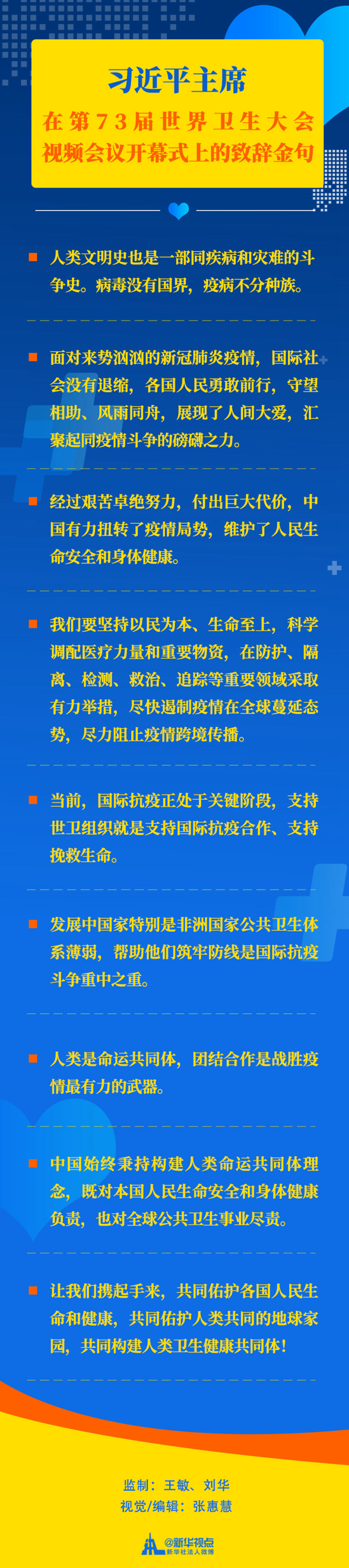 習近平主席在第73屆世界衛(wèi)生大會視頻會議開幕式上的致辭金句