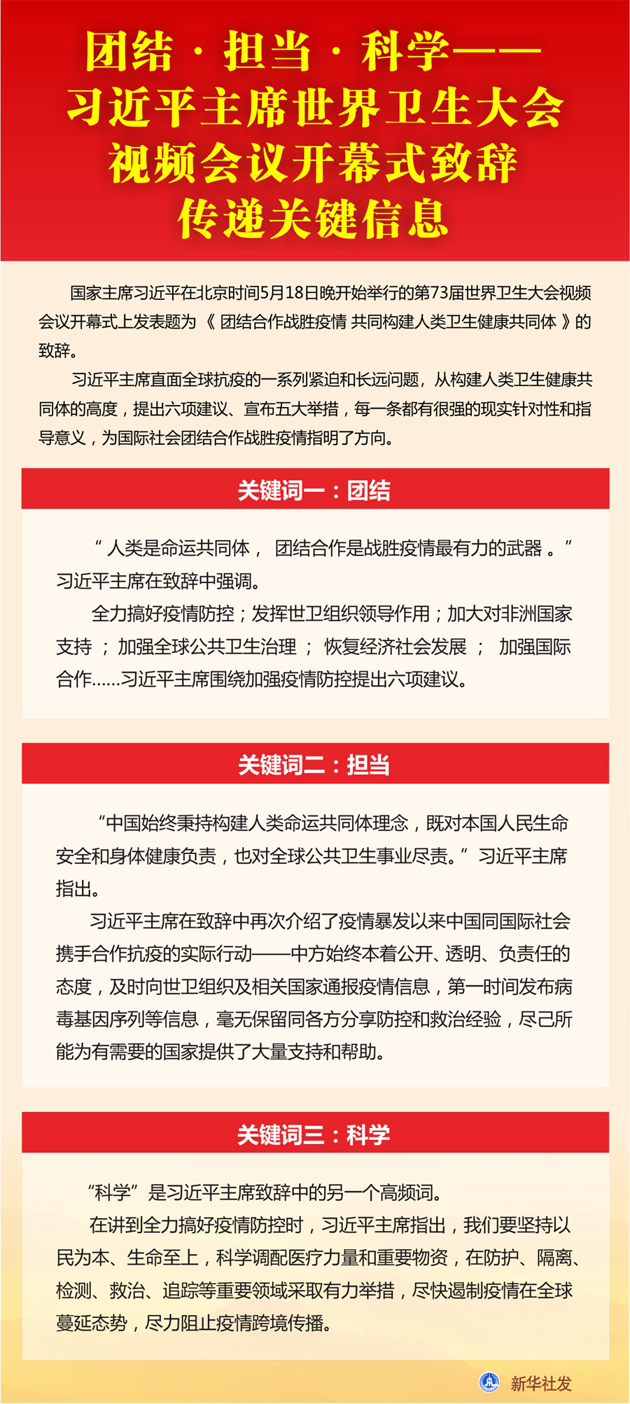 新華社北京5月18日電? 綜合新華社駐外記者報道:國家主席習(xí)近平18日晚在第73屆世界衛(wèi)生大會視頻會議開幕式上發(fā)表題為《團(tuán)結(jié)合作戰(zhàn)勝疫情 共同構(gòu)建人類衛(wèi)生健康共同體》的致辭。世界衛(wèi)生組織官員及多國人士認(rèn)為,習(xí)近平主席在致辭中提出的加強(qiáng)疫情防控六項建議、中國為推進(jìn)全球抗疫合作的五大舉措秉持構(gòu)建人類命運(yùn)共同體理念,體現(xiàn)了中國負(fù)責(zé)任大國擔(dān)當(dāng),對推動抗擊疫情國際合作具有重要意義。
