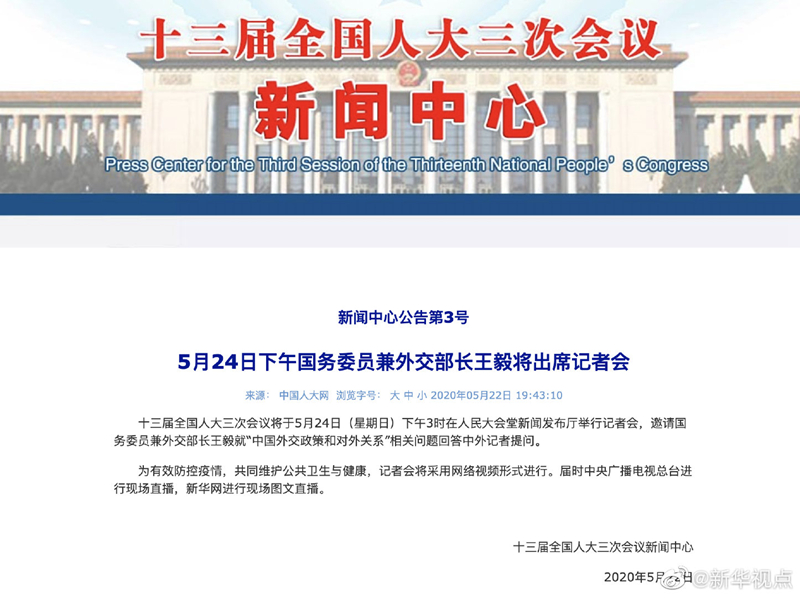 十三屆全國(guó)人大三次會(huì)議將于5月24日(星期日)下午3時(shí)在人民大會(huì)堂新聞發(fā)布廳舉行記者會(huì),邀請(qǐng)國(guó)務(wù)委員兼外交部長(zhǎng)王毅就“中國(guó)外交政策和對(duì)外關(guān)系”相關(guān)問(wèn)題回答中外記者提問(wèn)。