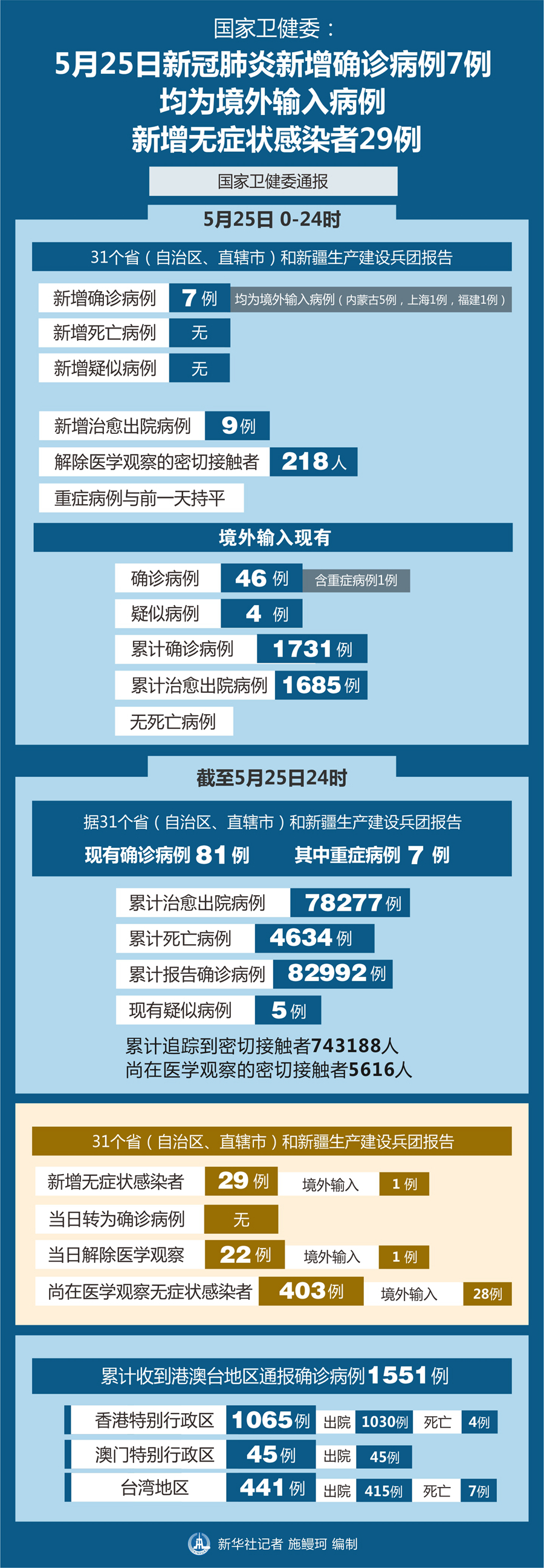 截至5月25日24時,據(jù)31個?。ㄗ灾螀^(qū)、直轄市)和新疆生產(chǎn)建設(shè)兵團報告,現(xiàn)有確診病例81例(其中重癥病例7例),累計治愈出院病例78277例,累計死亡病例4634例,累計報告確診病例82992例,現(xiàn)有疑似病例5例。累計追蹤到密切接觸者743188人,尚在醫(yī)學(xué)觀察的密切接觸者5616人。