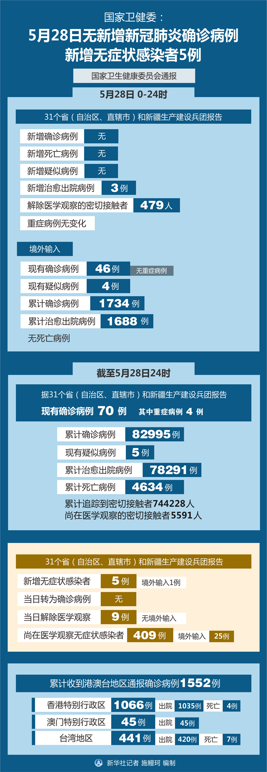 截至5月28日24時,據(jù)31個?。ㄗ灾螀^(qū)、直轄市)和新疆生產(chǎn)建設(shè)兵團(tuán)報告,現(xiàn)有確診病例70例(其中重癥病例4例),累計治愈出院病例78291例,累計死亡病例4634例,累計報告確診病例82995例,現(xiàn)有疑似病例5例。累計追蹤到密切接觸者744228人,尚在醫(yī)學(xué)觀察的密切接觸者5591人。