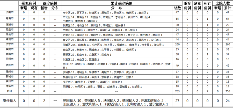山東無(wú)本地住院疑似病例、確診病例。累計(jì)報(bào)告確診病例763例,死亡7例,治愈出院756例。