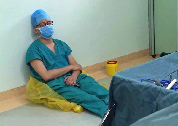 在幾臺手術的間隙,于鐵夫睡倒在手術室里(資料照片)。新華社發(fā)
