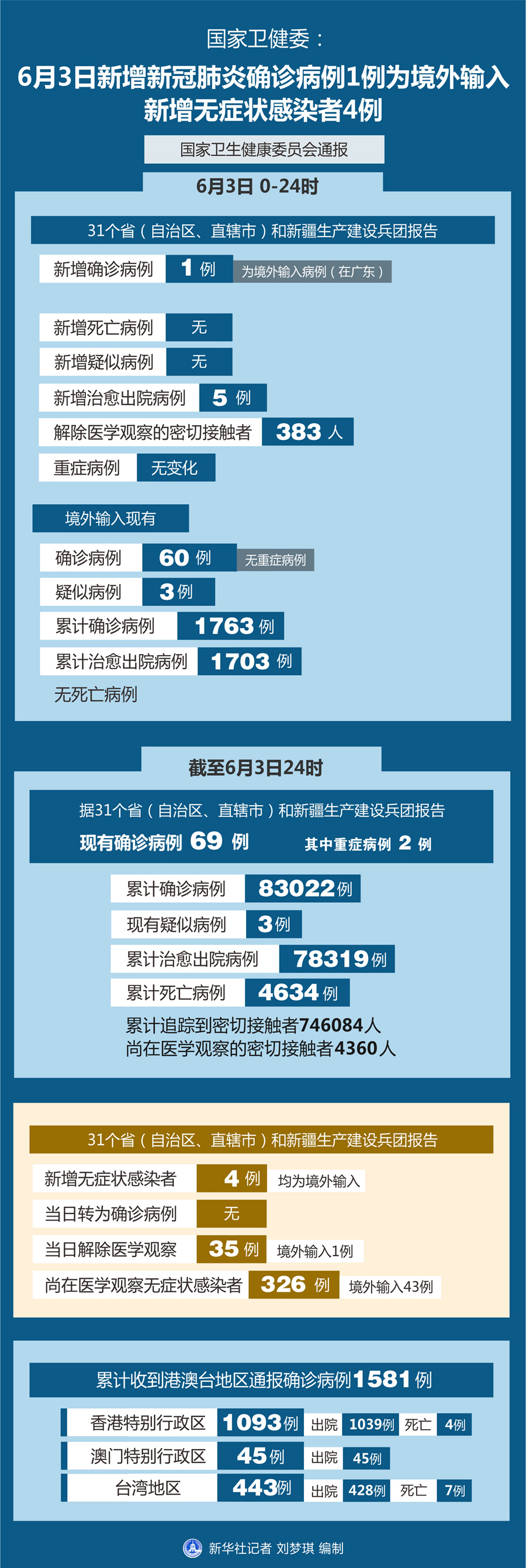 截至6月3日24時,據31個?。ㄗ灾螀^(qū)、直轄市)和新疆生產建設兵團報告,現(xiàn)有確診病例69例(其中重癥病例2例),累計治愈出院病例78319例,累計死亡病例4634例,累計報告確診病例83022例,現(xiàn)有疑似病例3例。累計追蹤到密切接觸者746084人,尚在醫(yī)學觀察的密切接觸者4360人。