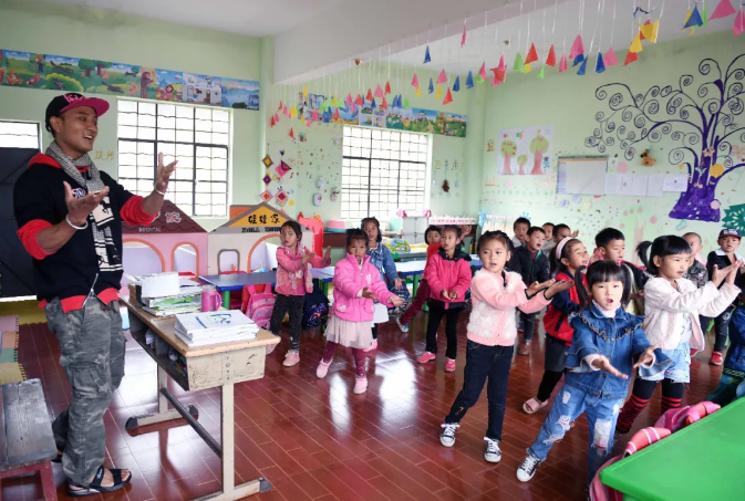 云南省西盟佤族自治縣勐梭鎮(zhèn)班母村佤山育忠幼兒園的孩子跟著老師上音樂(lè)課 楊宗友 攝