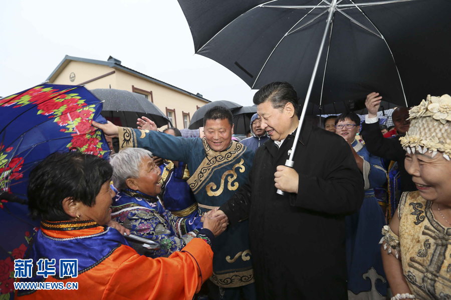 2014年春節(jié)前夕,習近平來到內(nèi)蒙古,看望慰問各族干部群眾。他來到錫林浩特市寶力根蘇木(鄉(xiāng))冬季那達慕,同牧民們一起觀摔跤,看賽馬,聽長調(diào),賞歌舞。在傳統(tǒng)的“五畜祈?!眱x式上,他按照蒙古族習俗,用無名指蘸上銀碗盛著的鮮牛奶彈了三下,祝福來年風調(diào)雨順,五畜興旺,人民幸福安康。