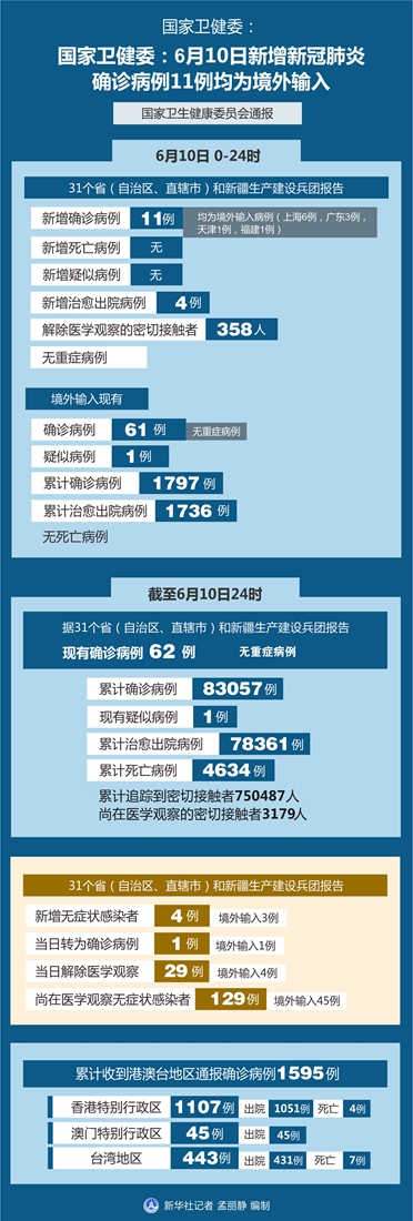 截至6月10日24時(shí),據(jù)31個(gè)?。ㄗ灾螀^(qū)、直轄市)和新疆生產(chǎn)建設(shè)兵團(tuán)報(bào)告,現(xiàn)有確診病例62例(無(wú)重癥病例),累計(jì)治愈出院病例78361例,累計(jì)死亡病例4634例,累計(jì)報(bào)告確診病例83057例,現(xiàn)有疑似病例1例。累計(jì)追蹤到密切接觸者750487人,尚在醫(yī)學(xué)觀察的密切接觸者3179人。