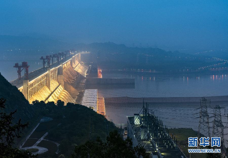 6月8日拍攝的三峽大壩泄洪閘夜景。 6月8日17時,三峽水庫水位消落至144.99米,提前兩天完成消落任務(wù)。據(jù)長江水利委員會介紹,三峽水庫本輪消落自2019年12月開始,水位自正常蓄水位175米左右消落至汛限水位145米,共消落水位約30米,騰出防洪庫容221.5億立方米,為迎戰(zhàn)長江流域可能發(fā)生的洪水提供安全保障。 新華社發(fā)(向紅梅 攝)