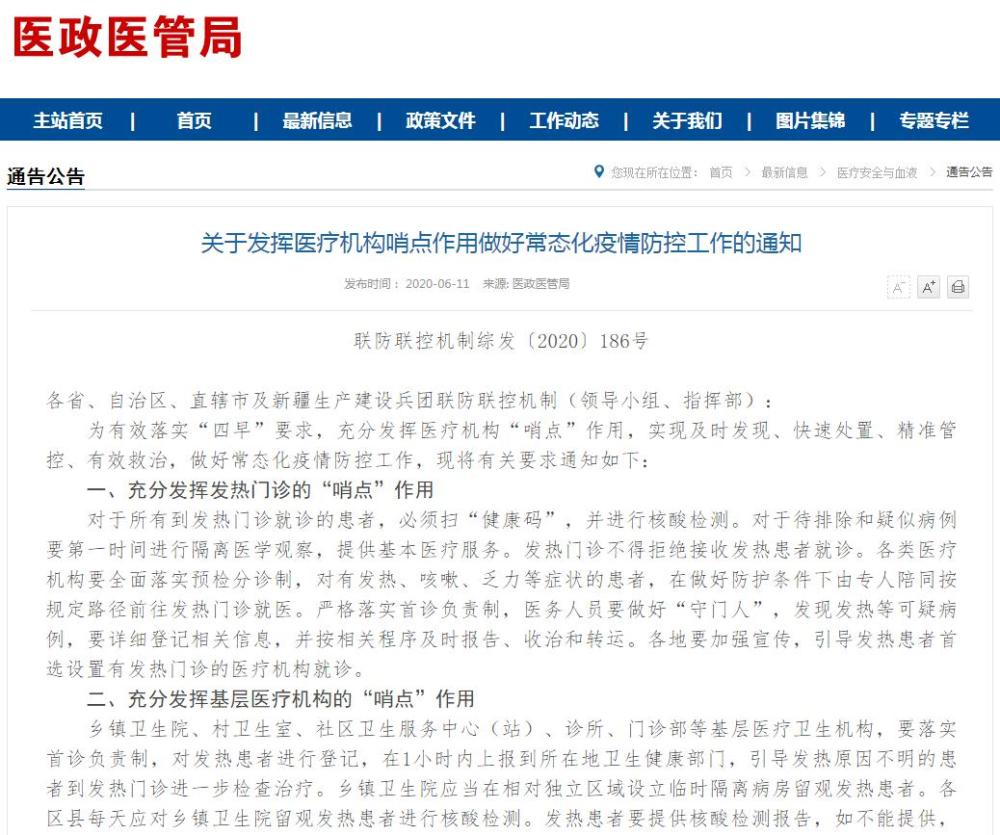 據(jù)國家衛(wèi)健委官網(wǎng)消息,11日國務(wù)院應(yīng)對新型冠狀病毒肺炎疫情聯(lián)防聯(lián)控機制綜合組發(fā)布了《關(guān)于發(fā)揮醫(yī)療機構(gòu)哨點作用做好常態(tài)化疫情防控工作的通知》,通知稱,對于所有到發(fā)熱門診就診的患者,必須掃“健康碼”,并進行核酸檢測。