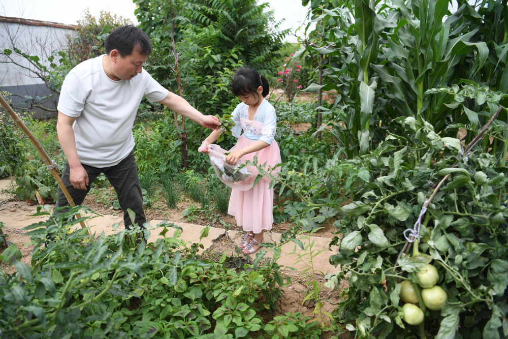 ↑?小思揚和爸爸一起采摘蔬菜。