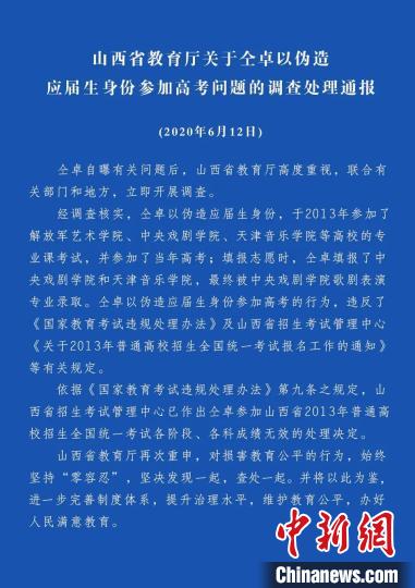 經(jīng)調(diào)查核實(shí),仝卓以偽造應(yīng)屆生身份,于2013年參加解放軍藝術(shù)學(xué)院、中央戲劇學(xué)院、天津音樂(lè)學(xué)院等高校的專(zhuān)業(yè)課考試,并參加當(dāng)年高考,被中央戲劇學(xué)院歌劇表演專(zhuān)業(yè)錄取。依據(jù)《國(guó)家教育考試違規(guī)處理辦法》第九條之規(guī)定,山西省招生考試管理中心作出仝卓參加山西省2013年普通高校招生全國(guó)統(tǒng)一考試各階段、各科成績(jī)無(wú)效的處理決定。