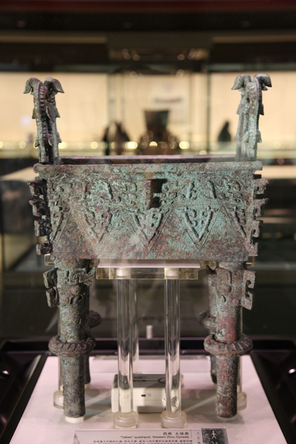 “從形制大小來(lái)看,有別于三足圓鼎,這件四足方鼎應(yīng)該是西周早期貴族所用的器物。方鼎高50.7厘米、口徑23.36厘米、重26公斤。方鼎的腹部?jī)?nèi)壁上清晰地鑄有‘大保鑄’三字銘文。據(jù)考證,這‘大?!制鋵?shí)應(yīng)該為‘太?!?,因此這件方鼎被稱作太保鼎?!标愖空f(shuō)。