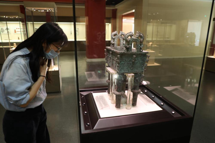 “造型雄偉,工藝精湛,鼎口雙耳上浮雕雙獸,腹部四面用圓雕、浮雕技法,分別飾有垂葉紋和饕餮紋,四角扉棱突起,別具風(fēng)格,最有趣的是鼎的柱足也裝飾有扉棱,并在中間裝飾有圓盤(pán),這在商周青銅器中是獨(dú)一無(wú)二的?!标愖空f(shuō)。