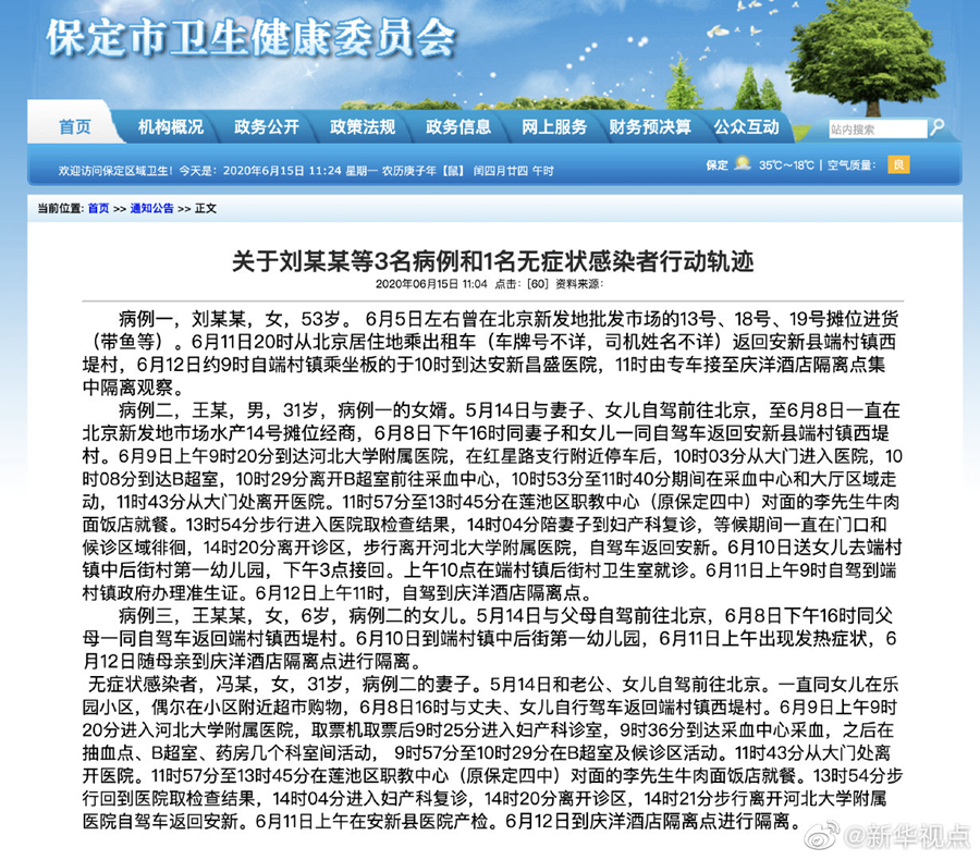 病例一,劉某某,女,53歲。6月5日左右曾在北京新發(fā)地批發(fā)市場的13號、18號、19號攤位進貨(帶魚等)。6月11日20時從北京居住地乘出租車(車牌號不詳,司機姓名不詳)返回安新縣端村鎮(zhèn)西堤村,6月12日約9時自端村鎮(zhèn)乘坐板的于10時到達安新昌盛醫(yī)院,11時由專車接至慶洋酒店隔離點集中隔離觀察。