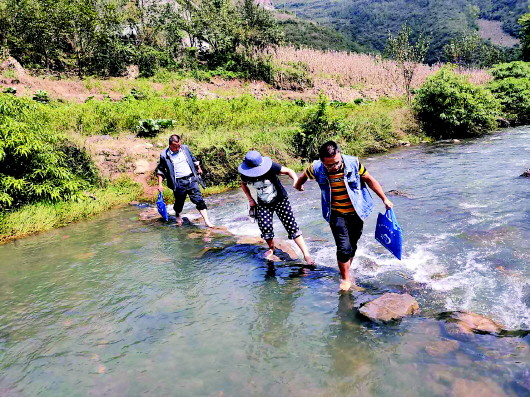 納雍縣鍋圈巖鄉(xiāng)土補(bǔ)村扶貧特崗張龍(右)與張迪(中)等蹚水過河走訪貧困戶。組圖均由受訪者提供(手機(jī)拍攝)