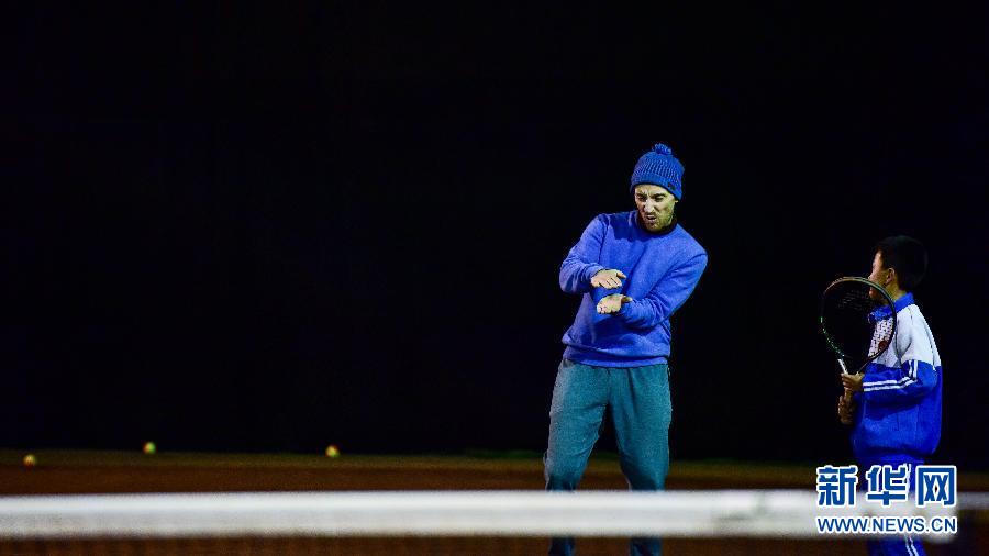 在青海省海東市互助土族自治縣的網(wǎng)球場內(nèi),喬西·羅賓遜(左)在指導(dǎo)學(xué)員發(fā)球(2019年11月7日攝)。新華社記者吳剛攝