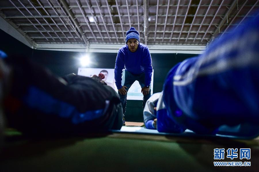 在青海省海東市互助土族自治縣的網(wǎng)球場內(nèi),喬西·羅賓遜帶領(lǐng)學(xué)員進(jìn)行拉伸運動(2019年11月7日攝)。 新華社記者吳剛攝