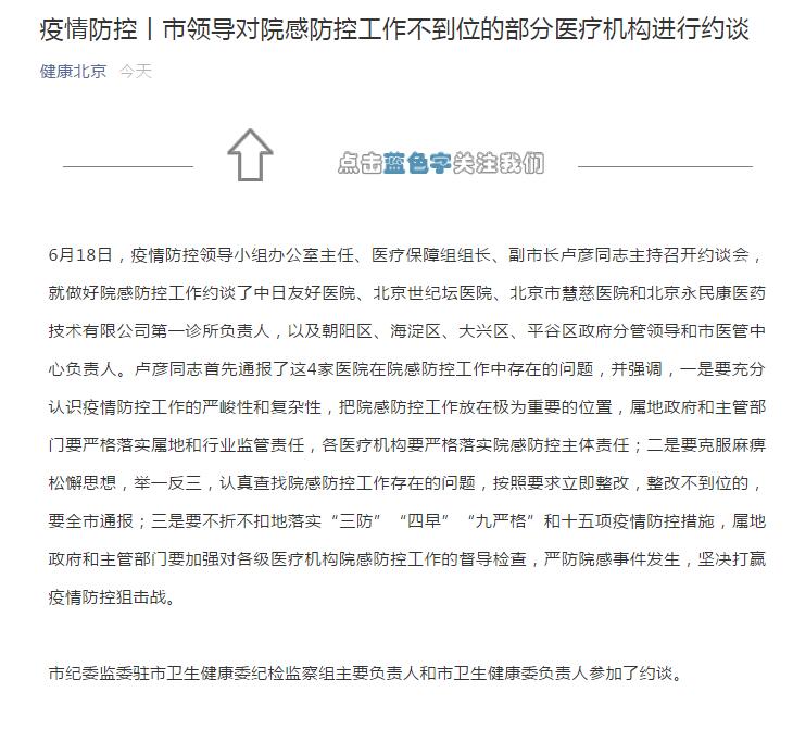 據(jù)北京市衛(wèi)健委微信公眾號消息,6月18日,疫情防控領(lǐng)導(dǎo)小組辦公室主任、醫(yī)療保障組組長、副市長盧彥同志主持召開約談會,就做好院感防控工作約談了中日友好醫(yī)院、北京世紀(jì)壇醫(yī)院、北京市慧慈醫(yī)院和北京永民康醫(yī)藥技術(shù)有限公司第一診所負(fù)責(zé)人,以及朝陽區(qū)、海淀區(qū)、大興區(qū)、平谷區(qū)政府分管領(lǐng)導(dǎo)和市醫(yī)管中心負(fù)責(zé)人。