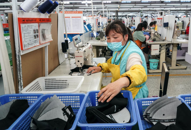 淮安源通制帽有限公司扶貧車(chē)間內(nèi),工人在生產(chǎn)帽子 楊磊 攝