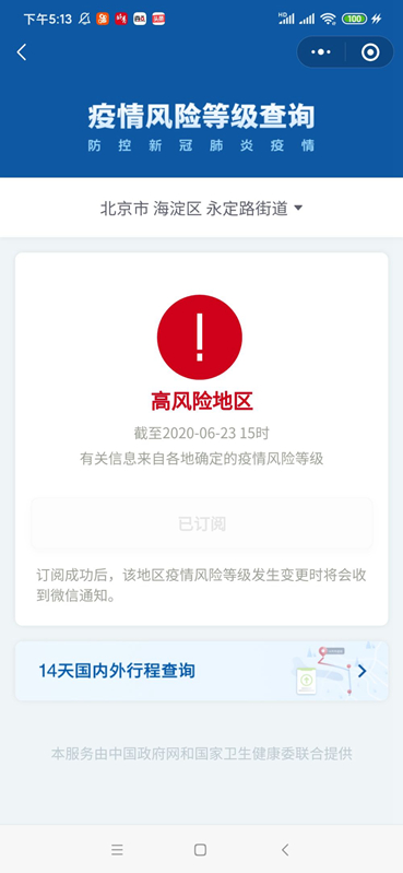 北京又增一個(gè)高風(fēng)險(xiǎn)地區(qū)! 記者從國(guó)務(wù)院客戶端小程序“疫情風(fēng)險(xiǎn)等級(jí)查詢”上了解到,截至6月23日15時(shí),北京市海淀區(qū)永定路街道由中風(fēng)險(xiǎn)調(diào)整為高風(fēng)險(xiǎn)。