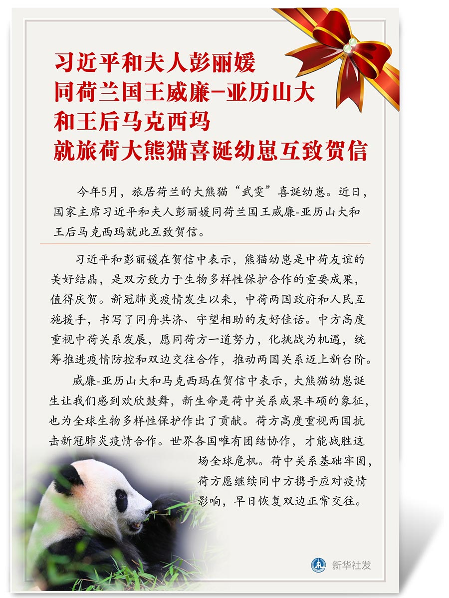 新華社北京6月25日電 今年5月,旅居荷蘭的大熊貓“武雯”喜誕幼崽。近日,國家主席習近平和夫人彭麗媛同荷蘭國王威廉-亞歷山大和王后馬克西瑪就此互致賀信。