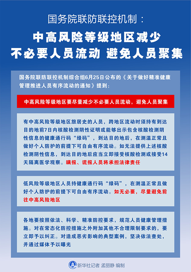新華社北京6月25日電(記者王秉陽)國務院聯(lián)防聯(lián)控機制綜合組25日公布的《關于做好精準健康管理推進人員有序流動的通知》提到,中高風險等級地區(qū)要盡量減少不必要人員流動,避免人員聚集。