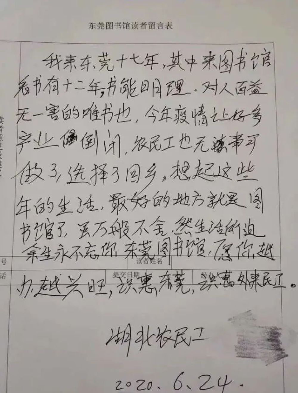 “我來東莞十七年,其中來圖書館看書有十二年。書能明理,對人百益無一害的唯書也。今年疫情讓好多產(chǎn)業(yè)(企業(yè))倒閉,農(nóng)民工也無事可做了,選擇了回鄉(xiāng)。想起這些年的生活,最好的地方就是圖書館了。雖萬般不舍,然生活所迫,余生永不忘你,東莞圖書館,愿你越辦越興旺。識惠東莞,識惠外來農(nóng)民工。”