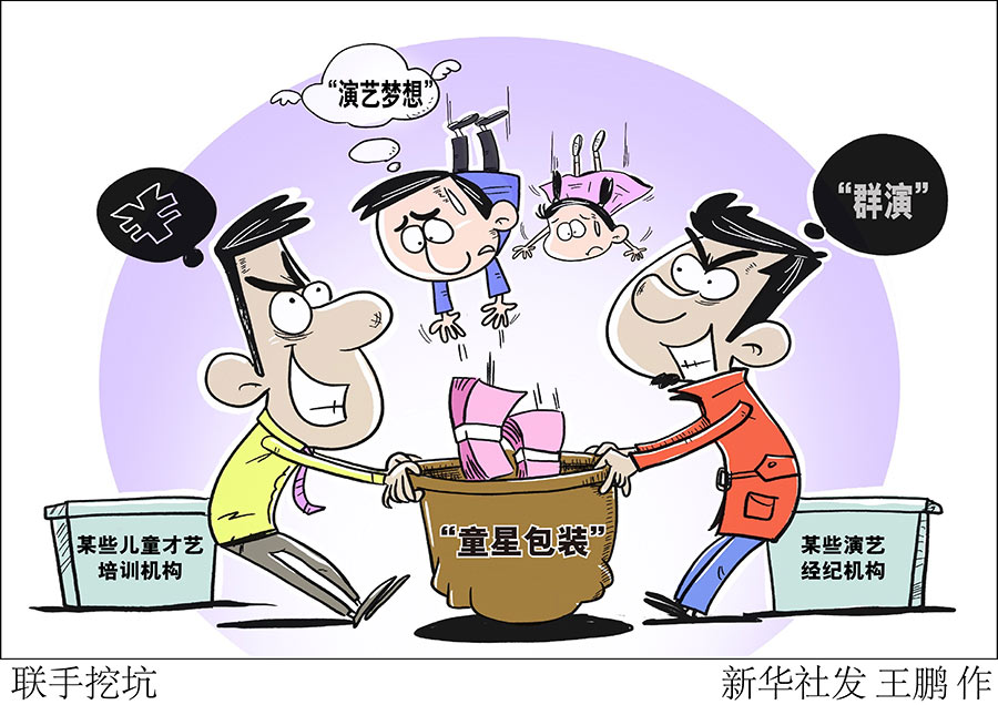 在兒童才藝培訓(xùn)市場缺乏有效監(jiān)管的現(xiàn)狀下,一些培訓(xùn)機(jī)構(gòu)、演藝經(jīng)紀(jì)公司以才藝培訓(xùn)作幌子,動(dòng)輒向家長收取上萬元培訓(xùn)費(fèi)用,其實(shí)是兜售表演機(jī)會(huì);而演藝經(jīng)紀(jì)機(jī)構(gòu)一旦高價(jià)“招募”到一名兒童演員,就會(huì)給培訓(xùn)機(jī)構(gòu)分成,培訓(xùn)機(jī)構(gòu)借此也能顯示與電視臺(tái)、節(jié)目制作方有合作,對(duì)招生構(gòu)成“金字招牌”,容易吸引家長報(bào)班,二者合作心照不宣。