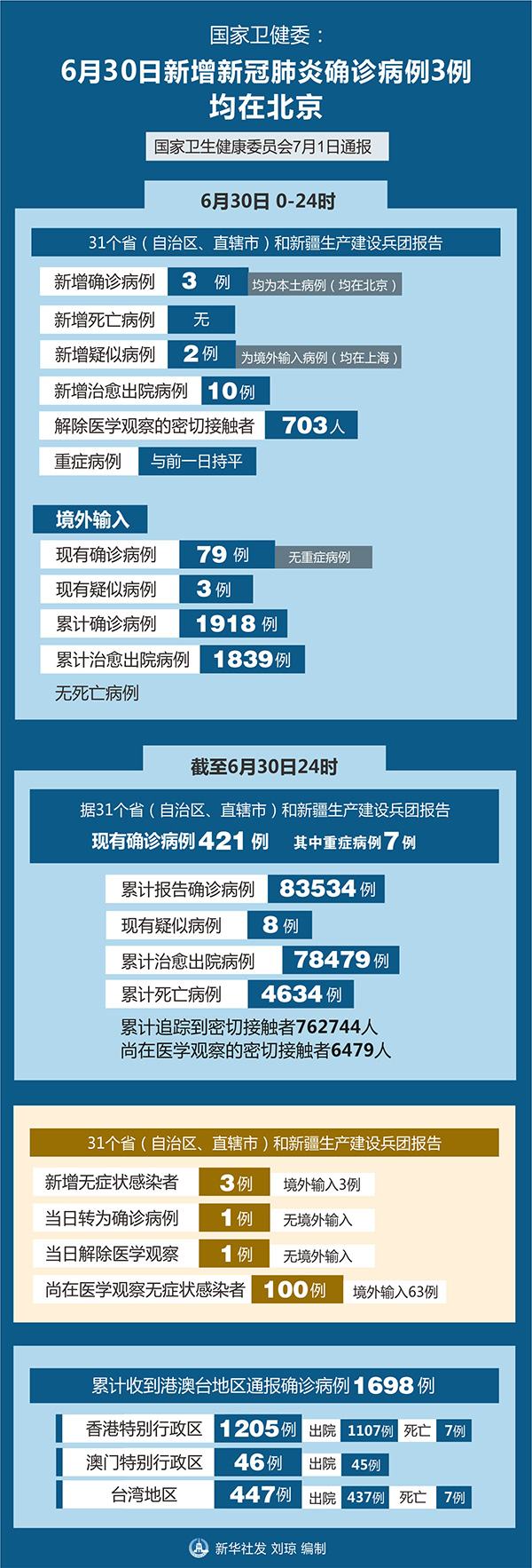 截至6月30日24時,據(jù)31個?。ㄗ灾螀^(qū)、直轄市)和新疆生產(chǎn)建設(shè)兵團報告,現(xiàn)有確診病例421例(其中重癥病例7例),累計治愈出院病例78479例,累計死亡病例4634例,累計報告確診病例83534例,現(xiàn)有疑似病例8例。累計追蹤到密切接觸者762744人,尚在醫(yī)學(xué)觀察的密切接觸者6479人。