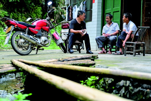 在湖南岳陽(yáng)平江縣大洲鄉(xiāng)上洲村,向彩旺(左)在貧困戶家中了解情況(7月3日攝)。記者陳澤國(guó)攝