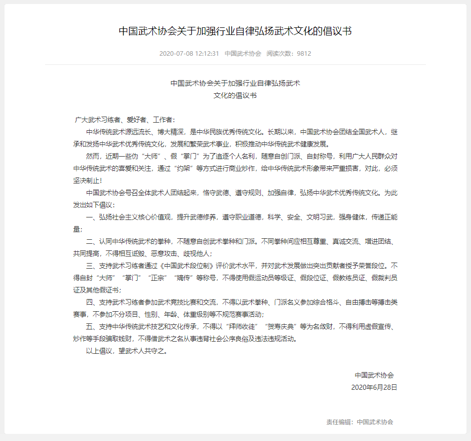 中國武術協(xié)會在其網站發(fā)布《關于加強行業(yè)自律弘揚武術文化的倡議書》,號召全體武術人團結起來,恪守武德、遵守規(guī)則、加強自律,弘揚中華武術優(yōu)秀傳統(tǒng)文化,并倡議武術習練者不得自封“大師”“掌門”“正宗”“嫡傳”等稱號,不得以武術拳種、門派名義參加綜合格斗、自由搏擊等搏擊類賽事,不參加不分項目、性別、年齡、體重級別等不規(guī)范賽事活動。
