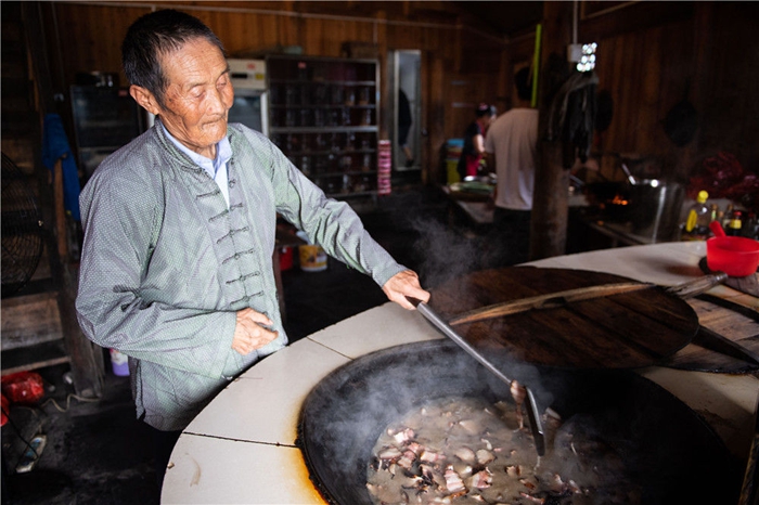 在湘西十八洞村,82歲的施成富在自家的農(nóng)家樂(lè)里炒臘肉(6月29日攝)。新華社記者 陳思汗 攝