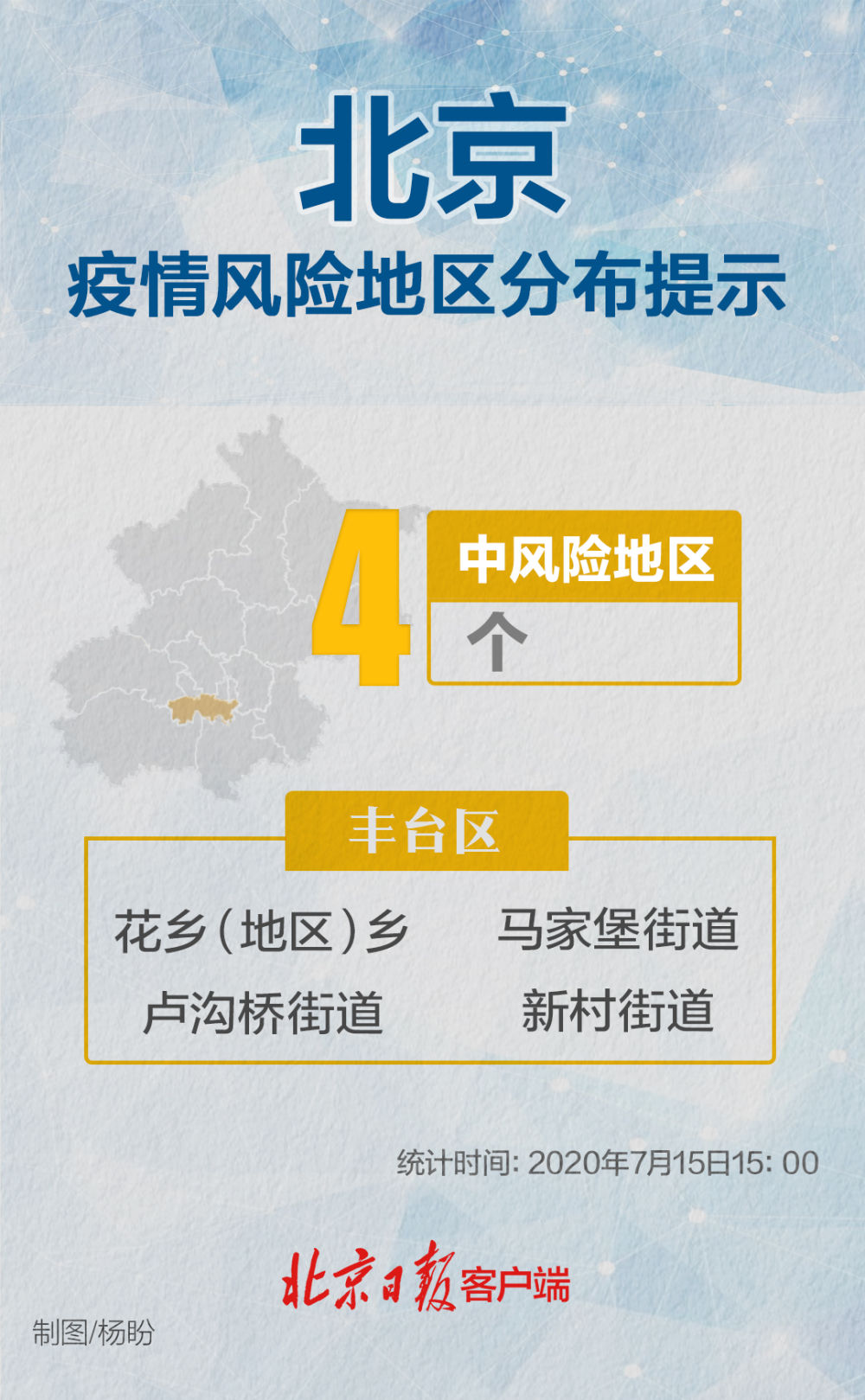 今天下午,在北京市新型冠狀病毒肺炎疫情防控工作第152場(chǎng)新聞發(fā)布會(huì)上,市疾控中心副主任龐星火介紹,7月14日0時(shí)至24時(shí),北京無(wú)新增報(bào)告確診病例。經(jīng)評(píng)估,大興區(qū)青云店鎮(zhèn)、西紅門(mén)鎮(zhèn)、興豐街道連續(xù)14天內(nèi)無(wú)新增本地確診病例,由中風(fēng)險(xiǎn)地區(qū)調(diào)整為低風(fēng)險(xiǎn)地區(qū)。截至目前,北京市共有中風(fēng)險(xiǎn)地區(qū)4個(gè),為豐臺(tái)區(qū)花鄉(xiāng)鄉(xiāng)、盧溝橋街道、馬家堡街道、新村街道。豐臺(tái)區(qū)其余街道為低風(fēng)險(xiǎn)地區(qū)。