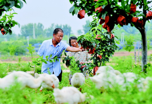 6月11日,李?。ㄗ螅┰谕┌乜h埠江鎮(zhèn)付樓村黃金梨種植基地查看黃金梨套袋情況。本報記者郝源攝